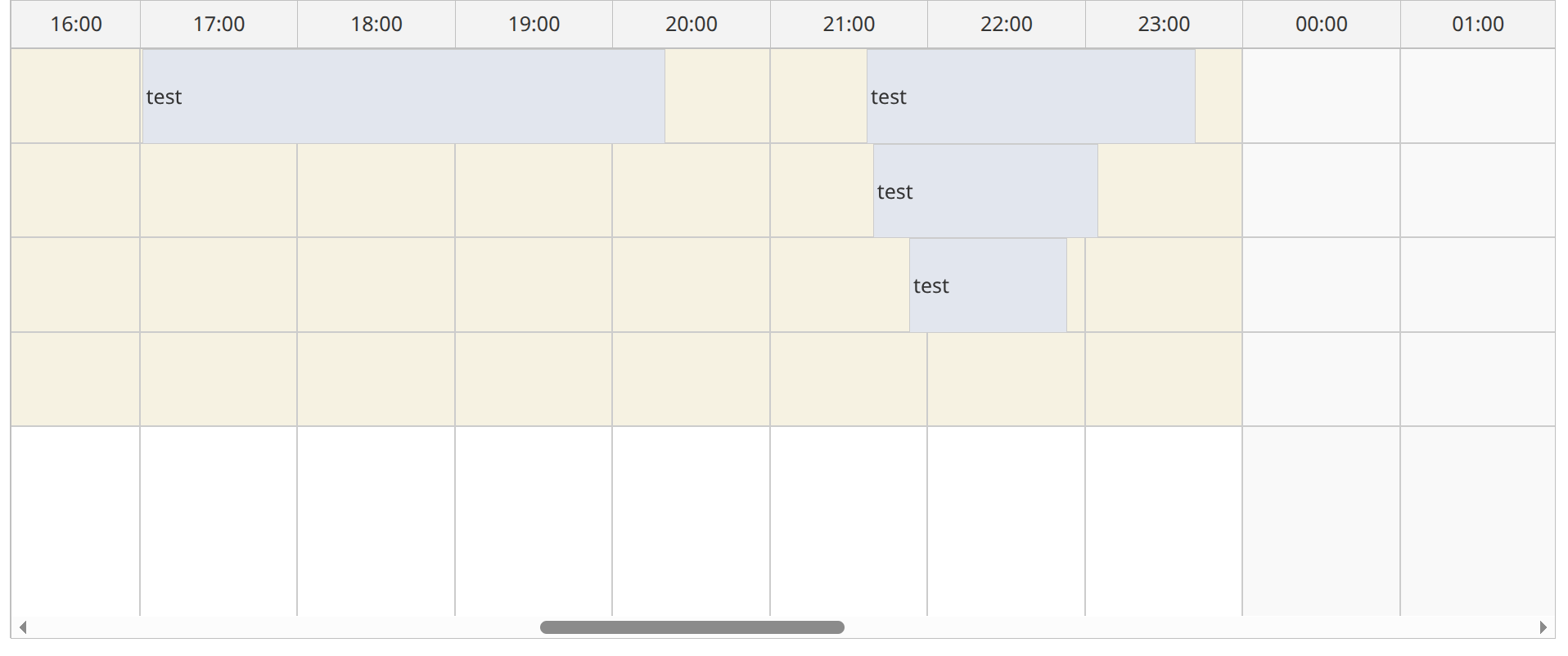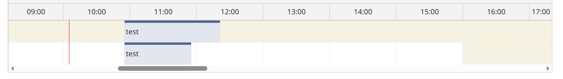 For example, if I have EventA that is 9:00-10:00 and EventB that is 10:00-11:00, they would appear on the same row, one after the other (there would be only one row only in the Scheduler). But if both events are 9:00-10:00, then they would be one on top of the other and there would be two rows visible in the Scheduler.