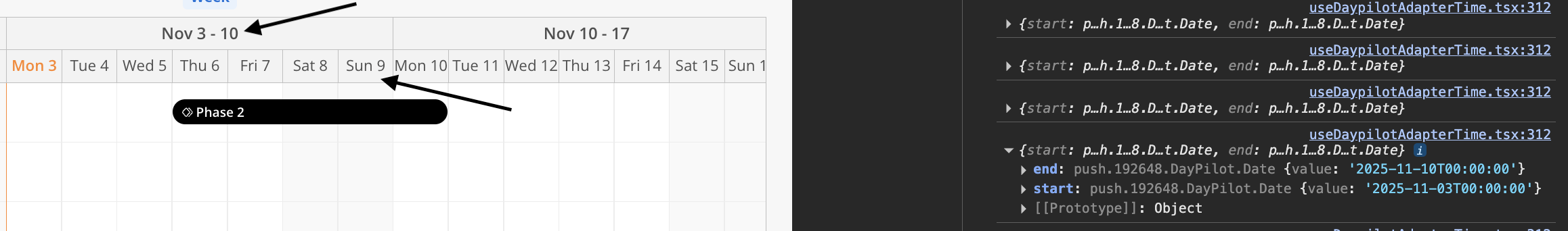 The value of args.header.end is correct: "2025-11-10T00:00:00" is the exact time point marking the end of the group.