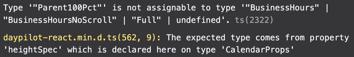 The documentation seems to not be up-to-date anymore since the proposed heightSpec “Parent100Pct” to get a 100% height of parent calendar is not an option, at least not in @daypilot/daypilot-lite-react v5.3.1.