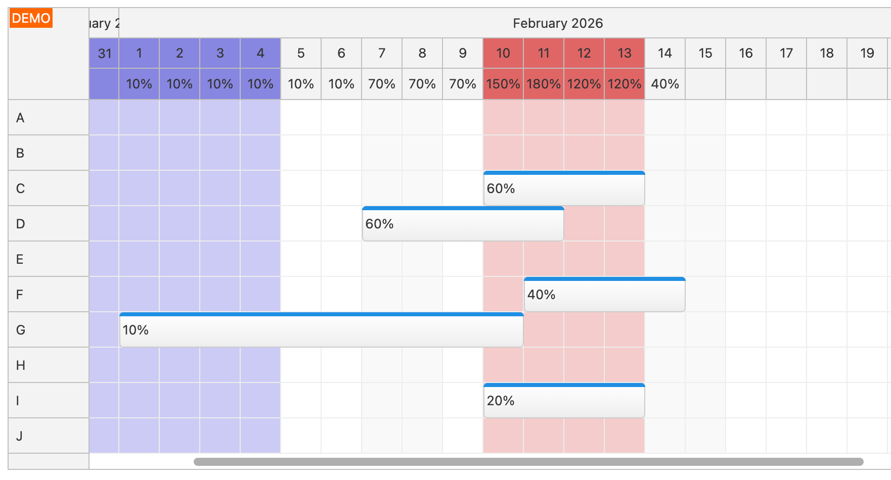 Mark this row with cellsAutoUpdated: true, that will re-render the content on every change (events loaded, event moved or created…).